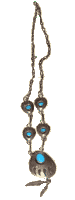 Bärentatzen Halskette aus Silber mit Türkise und zwei Silberfedern. |